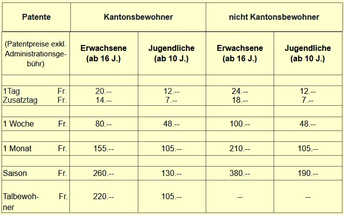 Der Pächter ist berechtigt, Tages-, Wochen-, Monats- und Saisonpatente abzugeben. Für einen bestimmten Zeitraum kann